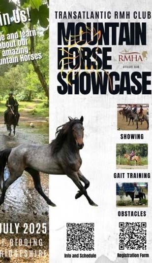 The Club has organised a Mountain Horse Showcase in Cambridgeshire in the UK for July of this year, and are very grateful to Florida-based Chris and Tara Stone, and Virginia-based Marianne and Joe Jolley for giving us their time and sharing their expertise. We are very much looking forward to hosting and learning from them, with RMH from many parts of the UK attending. This event will be a great social gathering with under-saddle and in-hand training, club-provided trail obstacles and obstacle training, plus a show and futurity. In addition, it gives a rare opportunity for owners to gain certification for their horses from in-person examiners without the challenge of video submission.